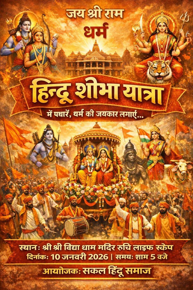 सकल हिन्दू समाज की एकता एवं जन जागरण के माध्यम से राष्ट्रोत्थान की भावना जागृत करने के उद्देश्य से दिनांक 11 जनवरी 2025 को सुबह 11.00 बजे से 2.00 बजे तक भाभा यूनिवर्सिटी परिसर में हिन्दू सम्मेलन का आयोजन किया जा रहा है। आप सभी सपरिवार इसमें सम्मिलित हो एवं अपने संपर्क वाले सभी व्यक्तियों को भी आमंत्रित करें।0 Comments 0 Shares 8 Views 0 Reviews